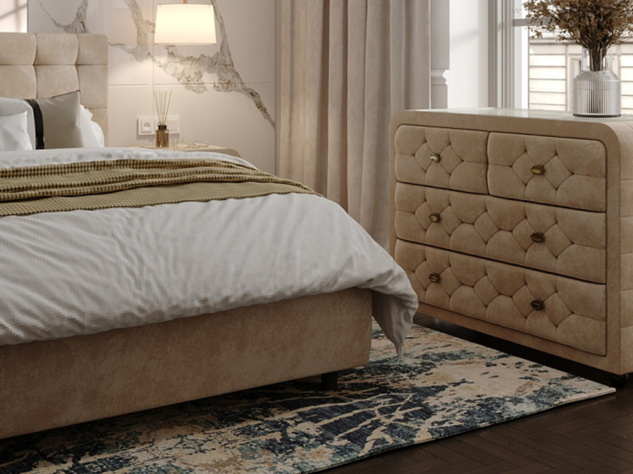 Современный многофункциональный комод Flavio на аккуратных ножках  с четырьмя вместительными выдвижными ящиками на скрытых направляющих с доводчиками, которые обеспечат плавное и бесшумное закрытие.