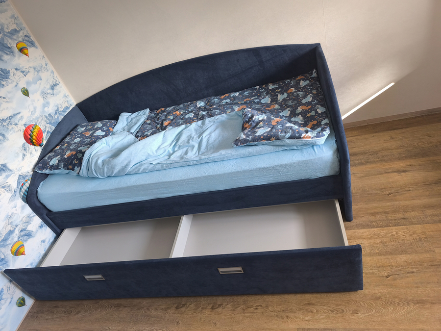 Под спальным местом расположены вместительные выкатные ящики на колесиках. Они легко открываются и идеально подходят для хранения постельного белья, одежды или игрушек.